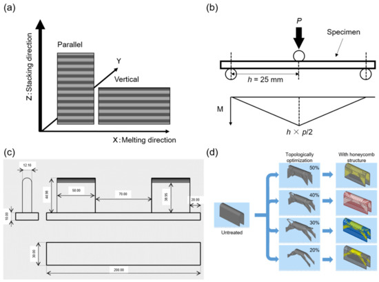 (a) Explanation of “parallel” and “vertical” to the stacking direction in specimen manufacturing. (b) Explanation of the three-point bending test. p: 0.2% offset load (N). h: distance between the loading roller and the supporting rollers (m). M: h × p/2 is the bending strength (N·m). (c) Design of a device for the bending test of tray-shaped specimens. p: load (N). Units in mm. (d) Design of tray-shaped specimens with topological optimization of 20%, 30%, 40%, and 50% volume fraction constraint. The right-hand side shows a design with a honeycomb structure added.