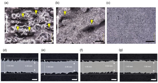 Digital microscope images of each specimen surface of (a) untreated, (b) alumina sandblast treatment, and (c) control. The white arrow indicates the stacking direction. The yellow triangles indicate the grooves. Bar = 100 mm. The grooves are formed in the vertical direction to the stacking direction, with the metal particles on the surface being removed using the alumina blasting treatment. Also shown are pictures of the cross section of the (d) PU, (e) VU, (f) PT, and (g) VT specimens. Bars = 0.5 mm. The surface of the specimen stretched parallel to the stacking direction is less rough than that of the specimen vertical to the stacking direction, as the alumina blasting treatment reduces the surface roughness.