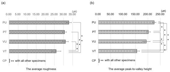 (a) Ra results. Although, there is no significant difference in the Ra results of the PU, PT, and VU specimens, the Ra result of the VT specimen is significantly lower. (b) Rz results. There is no significant difference between the PT and VU specimens. The Rz of the PU specimen is larger than that of the others, and that of the VT specimen is smaller than that of the others. * p < 0.05, ** p < 0.01.