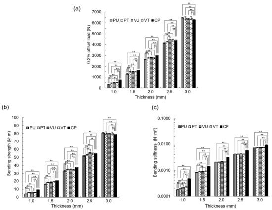 At 0.2% offset load, the PU specimen values were significantly lower than those of the other samples at thicknesses of 1.0, 1.5, and 2.0 mm. The VT specimen value was significantly higher than that of specimens with a thickness of 1.5 mm, and the VU specimen value was higher than that of specimens with a thickness of 2.0 mm. The PT specimen values were significantly higher than those of the PU specimens under the condition of thicknesses of 2.5 and 3.0 mm. The CP value was higher than that of other specimens under the condition of thickness of 1.0, 1.5, and 2.0 mm (Figure 5a).