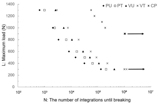 The number of integrations until breaking, under the same load, increased in the order of the PU, PV, VU, VT, and CP specimens. It was confirmed that the VT specimen did not break even when the number of integrations was 106 or more at 300 N (fatigue limit). The fatigue limit of the CP was 900 N (Figure 6).