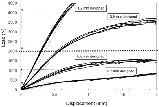 Six samples were prepared for each thickness during the preparation of the tray-shaped specimens. The specimens designed with a thickness of 0.3 and 0.6 mm had different thicknesses in the actual measurement, which were 0.770 ± 0.009 and 0.802 ± 0.004 mm, respectively. The specimens designed and prepared to a thickness of 0.9 mm were almost 0.1 mm thicker than the design, which was 1.003 ± 0.010 mm. Conversely, the 1.2 mm thick specimens were practically the same as the design, which was 1.253 ± 0.004 mm. The average 0.2% offset load values designed to have a thickness of 0.3, 0.6, 0.9, and 1.2 mm were 385 ± 5.0, 1081 ± 25.6, 2162 ± 21.1, and 4163 ± 45.3 N, respectively. The plastic deformation with the load of 2000 N was more than 2.0 mm for the specimens designed to have a thickness of 0.3 and 0.6 mm. Little plastic deformation was observed in the 0.9 and 1.2 mm thick specimens at 2000 N (Figure 7).