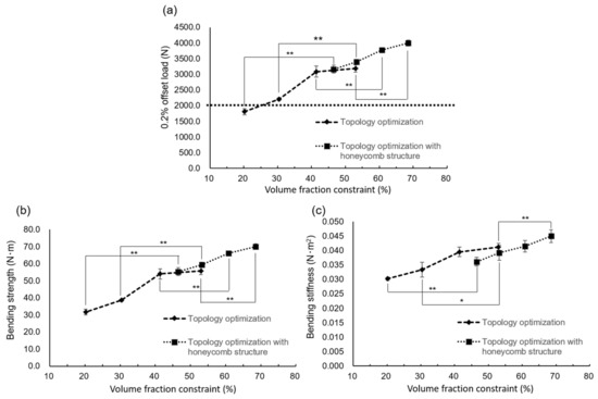 The bending strength increased significantly between 30% and 40% of the volume fraction constraint without the honeycomb structure (Figure 8b). The bending stiffness gradually increased with the volume fraction constraint (Figure 8c). The honeycomb structure increased both the bending strength and bending stiffness.