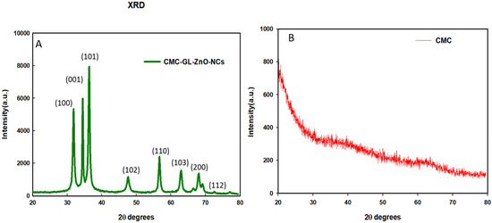 The XRD pattern demonstrated the crystallite size of the NCs by calculating the FWHMs of the three most intense diffraction peaks. The cotton-shape GL–CMC–ZnO NCs were composed of ZnO NPs with an average crystallite size of 28 nm (Table 2). The position, width, peak intensity, and FWHM data were calculated at a 2θ range of 20°–80°, which were indexed according to Miller indices (h, l, k) at (100), (001), and (101) lattice planes, respectively [32]. Figure 4A,B shows the XRD patterns of the GL–CMC–ZnO NCs and the CMC, respectively, where the CMC exhibited a broad diffraction peak at a 2θ range of 20°–35°, which confirmed the amorphous nature of the polymer. The hexagonal crystallite structure is thoroughly agreeable with the standard value JCPDS NO. 36−145 of ZnO nanocrystal [33]. In Figure 4A, the XRD pattern of the GL-CMC-ZnO NCs showed a hexagonal wurtzite structure of bulk ZnO with no extra peak that confirmed the purity of the ZnO NCs [34].