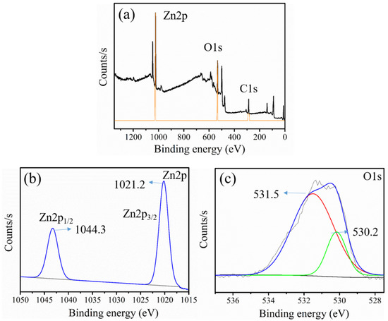 The chemical state of elements in ZnO was analyzed using XPS analysis, as shown in Figure 6. The full survey spectra displayed in Figure 6a suggested the presence of three major elements, i.e., Zn, O, and C, in the GL–CMC–ZnO NCs. The C1s peak in Figure 6a indicated the presence of C traces, which perhaps appeared to be from the plant extracts. The binding energy peaks appearing at 1021.2 and 1044.3 eV in Figure 6b were attributed to Zn2p3/2 and Zn2p½, respectively, suggested the existence of the Zn2+ state [36]. Besides, Figure 6c shows the binding energies of O1s at 530.2 and 531.5 eV were ascribed to Zn–O and C=O sites, respectively.