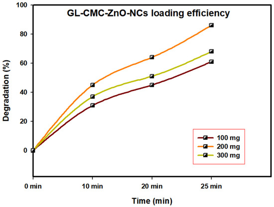 The GL–CMC–ZnO NCs act as a catalyst in different dye degradation rates under UV illumination; here, MB dye was checked for degradation by catalyst under UV illumination during the optimization process (Figure 8). At a concentration of 100 mg/L, the catalyst concentration was checked in different time intervals (0 min, 10, 20, and 25 min). Further, the concentration of the catalyst was increased from 100 to 300 mg/L to check the degradation rate. When the 300 mg/L catalyst was checked, the gradual degradation rate was lower than for the 200 mg and 100 mg mg/L catalysts. It may be due to the overlapping tendency of the catalyst upon dye molecules that restrict their interaction. The complete optimization process confirmed that the 200 mg/L catalyst concentration showed the highest degradation rate of dye molecules.