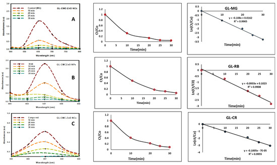 Photocatalytic activities of GL–CMC–ZnO NCs under UV irradiation with the kinetic study: (A) malachite green (MG) degradation with kinetic study; (B) Rhodamine B (RB) dye degradation with kinetic study; (C) Congo red (CR) dye degradation with kinetic study.