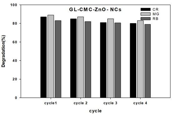 Reusability test results for the GL–CMC–ZnO NCs using dyes (CR, MG, and RB).