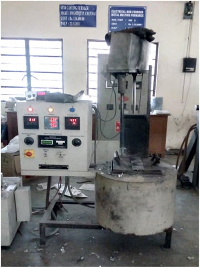 The stir casting process is frequently used for both ferrous and nonferrous components, and it is a reliable process [18]. Despite the different manufacturing methods of AMMCs, the stir casting technique was adopted by many researchers because of its commercial success in the production of large-sized components [19,20]. Moreover, the stir casting process has been proved as a simple and effective process for particle bonding due to stirring action during the addition of ceramic particles.