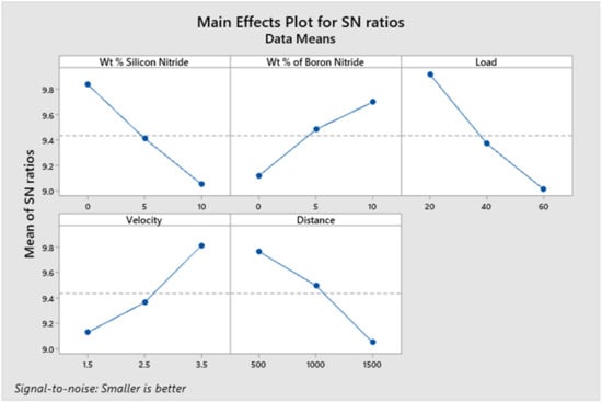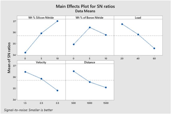Moreover, the thin lubricating film breaking due to increased pressure at the contact interface also leads to increased COF [23]. It is also revealed that the increase in sliding velocity lowers the COF between the surfaces of the counter bodies. The higher sliding velocity leads to thermal softening of the test pin surface due to an increased interface temperature [39]. This thermal softening causes a decrease in the hardness of the pin specimen, resulting in decreased COF. Moreover, the local shear strength of the test specimen is lowered at higher velocities due to increased temperature at the interface, thereby reducing the COF [40]. It is also seen from the main effect plot for COF that the COF increases as the sliding distance is increased. This increase in COF may be attributed to the increased frictional forces between the rubbing surfaces. At longer running distances, the formation of more wear debris between rubbing surfaces leads to increased friction forces, resulting in increased COF [41]. From Figure 5, it is found that the optimum combination of independent input parameters for minimum COF is 0 wt. % of Si3N4, 10 wt. % of BN, 20 N load, 3.5 m/s sliding velocity and 500m sliding distance.