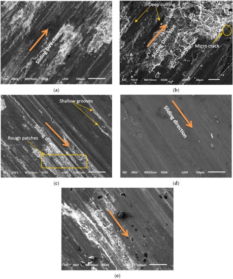 Figure 6 shows SEM micrographs of worn surfaces. In general, worn surfaces of the wear test specimens were analysed using SEM to understand the wear behaviour of the composite materials. Figure 6a,b show the worn surface of the Al7068/10BN composite specimen at low and high magnification, respectively, tested under severe operating conditions (higher normal load, sliding velocity and sliding distance). The worn surface exhibits long deformation bands and larger patches along the sliding direction, which indicates the existence of delamination wear. The higher weight fraction of solid lubricant (BN) particles reduces the composite’s resistance to deformation, which in turn causes increased wear loss [23,33]. Deep cutting and micro cracking are visible in Figure 6b. Figure 6c depicts the worn surface of the Al7068/10Si3N4 composite specimen under severe operating conditions. This SEM micrograph shows shallow grooves and rough patches along the sliding direction. The wear loss is lesser than that of the previous case due to the increased wear resistance of the composite specimen. This improvement in wear resistance may be attributed to the increase in hardness of the composite material with the addition of higher content of hard ceramic reinforcement [22]. The worn-out surface of a composite material reinforced with 10 wt. % of Si3N4 and 5 wt. % of BN is shown in Figure 6d. This micrograph depicts that the surface deformation is minimal. The presence of a higher amount of Si3N4 particles greatly improves the wear resistance of the composite material. In addition to that, the solid lubricant-rich film formed between the rubbing surfaces effectively prevents direct contact between the rubbing surfaces [46]. Therefore, the worn-out surface of Al7068/10Si3N4/5BN has minimal surface damage. The worn surface of the Al7068/10Si3N4/10BN composite specimen is shown in Figure 6e. This specimen has much-improved wear resistance due to higher Si3N4 content. However, higher BN content leads to particle detachment, thereby causing the projection of hard phases from the composite pin surface, which is evident from Figure 6e.