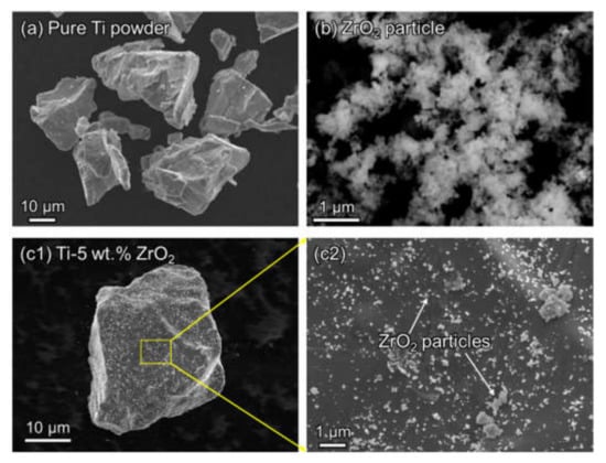 (a) SEM observation on pure Ti powder, (b) ZrO2 particles, (c1) pre-mixed Ti-5 wt.% ZrO2 powder and (c2) ZrO2 particles uniformly dispersed at Ti powder surface.