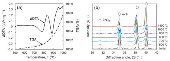 (a) Thermogravimetric-differential thermal analysis (TG-DTA) profiles of pre-mixed Ti-5 wt.% ZrO2 powder and (b) X-ray diffraction (XRD) profiles of Ti-5 wt.% ZrO2 composite sintered at 500 °C and heat treated at 600–1400 °C.