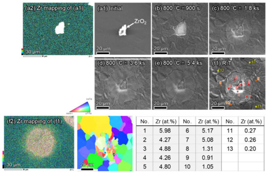 In situ SEM observations during heating at 800 °C were applied to the same Ti-5 wt.% ZrO2 sample to directly investigate the decomposition phenomenon of ZrO2 particles dispersed in Ti matrix, where the holding time was from 900 s to 5.4 ks with the constant magnification of 1000. As shown in Figure 3, compared to the initial sample (a1,a2) with no heat treatment and sample (b1,b2) that was heat-treated at 800 °C for 900 s, the white area around the ZrO2 particle expands to the matrix side; that is, the ZrO2 decomposition reaction starts in sample (b1). As the holding time increased from 900 s to 5.4 ks, the white area remarkably increased, and the IPF map of the SEM-EBSD analysis result (b2) indicated the grain growth inside the same white area. However, the results of the EDS analysis show that the original core part with high Zr content, corresponding to ZrO2 particles, remained the same even after heating at 800 °C for 5.4 ks. Moreover, the diffusion region of the Zr element is approximately 50 µm in diameter.