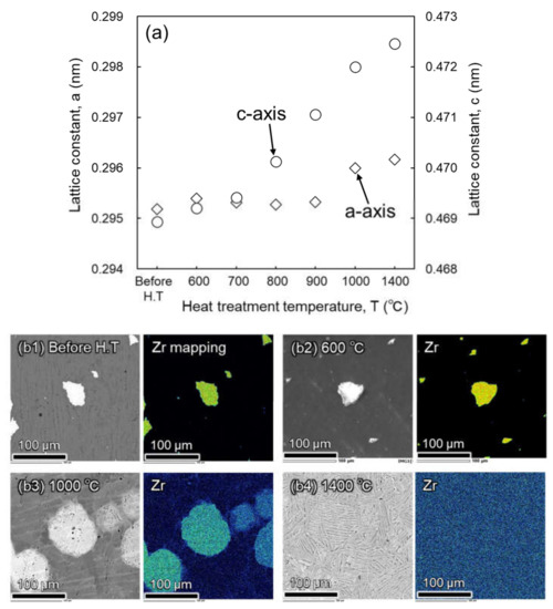 The changes in the a and c lattice constants were calculated based on the XRD profiles in Figure 2b using Bragg’s equation [30]. As shown in Figure 4a, the lattice constant in the a-axis has a value that is approximately the same as the constant value (0.2952–0.2954 nm) upon heating below 900 °C, and slightly increased by heat treatment from 900 to 1400 °C. On the other hand, the c lattice constant reveals a very small increase (0.4690–0.4694 nm) upon heating to 700 °C because of the absence of ZrO2 decomposition and the slight diffusion of Zr elements, as shown in the EDS results from Figure 4b1,b2. However, when the heat treatment temperature increased from 800 to 1400 °C, the c lattice constant drastically increased from 0.4702 to 0.4725 nm. According to the decomposition phenomenon of ZrO2 particles, the fast diffusion of O atoms in the α-Ti phase occurs after ZrO2 decomposition, and their solid-solution phenomenon causes a large lattice expansion in the c-axis direction, for example, Δc = 5.400 × 10−4 nm/at.% O and Δa = 0.122 × 10−4 nm/at.% O [28]. In addition, because Zr atoms gradually diffuse during heat treatment over 1000 °C and homogeneously dissolve in the matrix at 1400 °C, as shown in Figure 4(b3,b4), respectively, the c lattice constant increases more significantly as well as the lattice constant because the substitutional solution of Zr atoms in α-Ti crystals contributes to a small lattice expansion in the a-axis compared to the c-axis. For example, Δa = 1.501 × 10−4 nm/at.% Zr and Δc = 4.022 × 10−4 nm/at.% Zr are reported in the previous study [24].