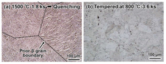 Furthermore, acicular martensite (α′) phases were formed in the Ti alloys quenched at 1500 °C. To obtain α-Ti grains of the sintered samples, an additional tempering treatment at 800 °C for 3.6 ks in vacuum (<100 Pa) was employed in this study. For example, Figure 5 shows the optical microstructures of sintered Ti-3 wt.%ZrO2 material after water-quenching (Figure 5a) and tempering (Figure 5b) treatment. It is clear that the acicular α′ phases formed by quenching in (Figure 5a) completely turned into coarse equiaxed α-Ti grains (Figure 5b) after tempering at 800 °C.