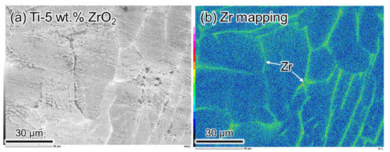 (a) SEM observation and (b) Zr mapping by EDS analysis of non-homogenized Ti-3 wt.% ZrO2 sintered material with Zr agglomeration at grain boundaries.