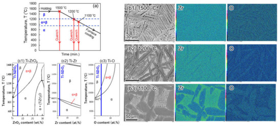 As shown in SEM-EDS analysis results of Figure 8b1–b3, 1500 °C quenched sample (b1) reveals both Zr and O elements uniformly dissolved in the Ti matrix (α′ phases). The sample quenched from 1200 °C (b2) consists of the primary α and acicular fine α′ phases in the prior β. The former α grains contain a smaller amount of Zr elements compared to the latter, but the O content is larger than that in α′ phases. In 1100 °C quenched sample (b3), the growth and coarsening of primary α grains are observed, and the difference in Zr content between primary α grains and prior β phases increases a lot compared to the sample (b2). This microstructures formation mechanism as mentioned above is considered as below. In comparing the Ti-ZrO2 pseudo-binary phase diagram (c1), binary phase diagrams of Ti-Zr (c2) and Ti-O (c3), the temperature range of α + β dual phases of Ti-5 wt.% ZrO2 material is 960–1220 °C, while that in Ti-Zr and Ti-O systems is 850–870 °C and 950–1120 °C, respectively. Therefore, Zr solutes exist more stably in β phase of Ti-5 wt.% ZrO2 material. In addition, O solid-solution is also more stable in α phase in α + β temperature range (in particular higher temperature). As a result, acicular α′ grains transformed from β phases contain a larger amount of Zr solutes, and the primary α phases are an enriched area of O atoms.