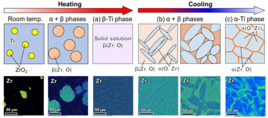 According to the above investigation results, the Zr agglomeration phenomenon of the Ti-ZrO2 material during cooling after SPS in the β phase region is schematically illustrated in Figure 9. During heating to the β phase temperature during sintering, ZrO2 decomposition and diffusion of Zr and O atoms occur. Both elements were uniformly dissolved in the β-Ti phases during sintering (Figure 9a). In the α + β temperature range during cooling after sintering, the diffusion of Zr and O atoms occurs in β-Ti and primary α-Ti phases, respectively. With decreasing temperature during slow cooling, α grain growth and coarsening occurred, and Zr solutes were exhaled from the primary α-Ti to the residual β phases (Figure 9b). Finally, in the α-Ti phase region, Zr agglomerates at the prior β grain boundaries (Figure 9c), which corresponds well to the network-structured Zr distribution shown in the EDS analysis results.