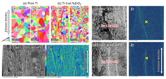 (a) EBSD analysis on pure Ti and (b) Ti-3 wt.% ZrO2 material (1) with or (2) without homogenization, (c) SEM-EDS results of extruded Ti-3 wt.% ZrO2 material with non-homogenization, and (d1,d2) relationship between Zr content and micro-hardness measured by nano-indentation of non-heat treated sample (c).