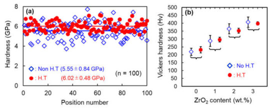 The effect of the uniform Zr solution on the matrix hardness of the extruded Ti-3 wt.% ZrO2 material was carried out by using nano-indentation tester. As shown in Figure 12a, the hardness measurement (number of tests; 100) of the homogenized sample (●: H.T) is 6.02 ± 0.48 GPa, and that of non-homogenized one (◇: Non H.T) is 5.55 ± 0.84 GPa. The measurement scatter of the former is significantly controlled owing to the uniform distribution of Zr solutes by the secondary homogenization heat treatment, as shown in Figure 10a2. When the ZrO2 content was changed from to 1–3 wt.% shown in Figure 12b, the hardness of both samples with H.T and non H.T increases linearly with their contents. However, it is obvious that the scatter of homogenized samples is also much smaller than that in non-H.T when changing the ZrO2 content.