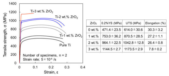 Figure 13 shows the tensile stress–strain curves of Ti-0-3 wt.% ZrO2 extruded materials with homogenization at room temperature, where the tensile properties are summarized in the attached table. With increasing ZrO2 content, 0.2 the yield stress (YS) and ultimate tensile strength (UTS) significantly increased; for example, the 0.2%YS mean value of Ti-3 wt.% ZrO2 sample (1144.5 MPa) is about 2.5 times that of pure Ti (471.4 MPa). On the other hand, the failure to elongate is sufficiently large (25.6–28.3%) until 2 wt.% ZrO2 addition, and even Ti-3 wt.% ZrO2 sample still shows 7.8% elongation.