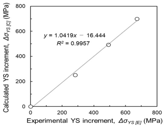 Figure 14 indicates the relationship of the YS increment between the experiment by tensile test () and the calculation using the Hall–Petch and Labusch equations (). It shows a sufficiently high determining factor (R2) of 0.9957, which indicates a strong positive correlation between the experimental results and the calculated values. That is, it is possible to quantitatively estimate the strengthening increment by α-Ti grain refinement and each solid-solution behavior of Ti-Zr-O alloys using the microstructural analysis results, Hall–Petch equation, and Labusch model.