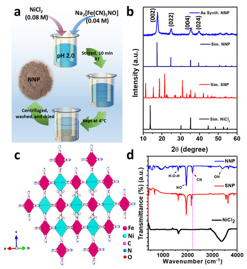 Figure 1a shows the schematic of the synthesis of NNP. Upon the addition of Ni2+(aq.), [Fe(CN)5NO]2−(aq.) react with the Ni2+(aq.) and form the precipitate of insoluble NNP according to the following reaction.