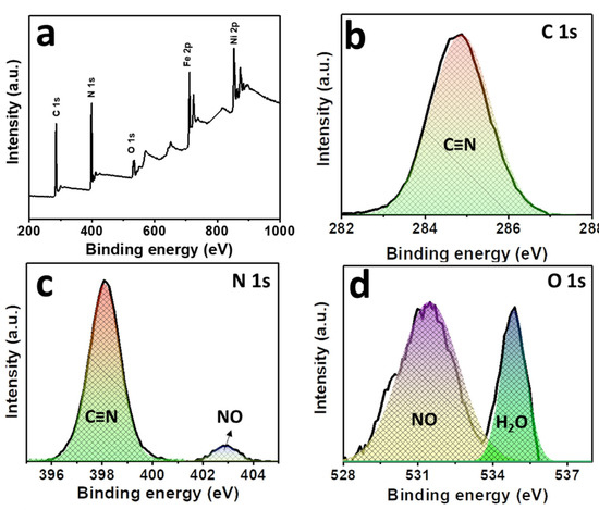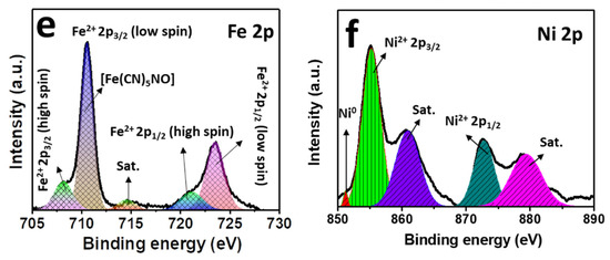 The compositions and the oxidation states of elements of NNP were analyzed by XPS. Figure 3a shows the survey spectra of NNP, which revealed the presence of C 1s, N 1s, O1s, Fe 2p, and Ni 2p in their respective reported binding energy values [44,45]. Figure 3b–f display the high-resolution XPS spectra of C 1s, N 1s, O 1s, Fe 2p, and Ni 2p, respectively, in NNP, and the binding energies of characteristics peaks are summarized in Table S3. The C 1s spectrum exhibited only a C≡N peak at a binding energy of 284.85 eV without the presence of any impurity peak. The deconvoluted and fitted N 1s spectra showed the C≡N and NO peaks at 398.10 and 402.90 eV, respectively, as expected from the compound formula [44,45]. The O 1s spectra comprise two-component peaks at the binding energies of 531.50 and 534.85 eV. The former can be ascribed to the NO peak, while the latter can be attributed to the oxygen peak arising from the crystalline water. The binding energies of C≡N, NO, and oxygen from water at the C 1s, N 1s, and O 1s spectra are close to the reported values of similar other compounds such as copper nitroprusside and SNP [44,46]. The core-level spectra of Fe 2p exhibited two spin-orbit doublets peaks of Fe 2p3/2 and Fe 2p1/2 with Fe2+ low spin at the binding energies of 710.60 and 720.60 eV, respectively, originated from the Fe2+ species, [Fe(CN)5NO], in NNP [44,47]. The spectrum also showed the contribution of two additional low-intensity peaks at 708.20 and 721.20. These can be attributed to the spin-orbit doublets peaks of Fe 2p3/2 and Fe 2p1/2, respectively, with Fe2+ high spin, formed by the partial degradation of NNP during the XPS experiment by altering the C≡N ligand bonds to the Fe atom (from Fe-CN to Fe-NC) [44,47]. This is further evidenced by the appearance of a weak satellite peak for the high spin Fe2+ at 714.65 eV [47]. The high-resolution spectra of Ni 2p displayed two main peaks at 855.15 and 872.30 eV. The former peak can be assigned to the Ni 2p3/2, while the latter peak can be ascribed to the Ni 2p1/2 [45,48]. The peak separation of 17.15 eV between the Ni 2p3/2 and Ni 2p1/2, and the presence of their corresponding satellite peaks at 860.85 and 879.45 eV, respectively, suggesting the +2 oxidation state of Ni in the NNP [45,48]. Furthermore, the Ni 2p spectrum displayed a very low-intensity metallic Ni peak at 851.30 eV [49], in contrast with its Ni2+ states in the NNP. This is conceivably due to the partial degradation of NNP induced by the high-energy X-ray beam during XPS measurement [44,46,47].