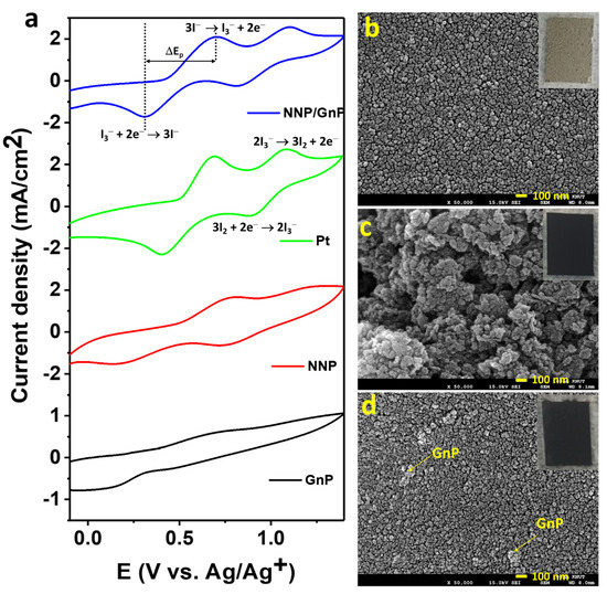 (a) CVs of the I-/I3- electrolyte at different CEs (scan rate: 100 mV/s). To-view FE-SEM images of (b) NNP, (c) GnP, and (d) NNP/GnP CEs. Insets of (b–d) show the digital photographs of NNP-, GnP-, and NNP/GnP-CEs, respectively.