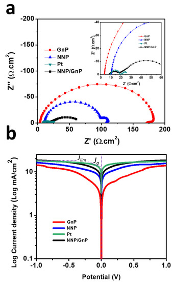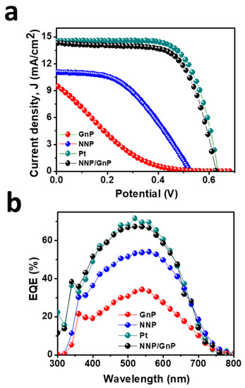 Tafel polarization plots of the dummy cells, similar to the one used for EIS, were measured to elucidate the electrochemical activity of the CEs further (Figure 5b). The exchange current density (Jo), calculated from the intercept of the linear fitting lines in the polarization curves [11], were 13.72, 10.80, 8.50, and 3.40 mA/cm2, respectively, for Pt-, NNP/GnP-, NNP-, and GnP-CEs, respectively. This result further suggests the better catalytic activity of NNP/GnP-CE for I−/I3− electrolyte than the NNP- and GnP-CEs and is slightly lower than the Pt-CE. The corresponding diffusion coefficient (Dn) of I−/I3− electrolyte at the NNP-, GnP-, NNP/GnP-, and Pt-CEs were 2.45 × 10−6, 2.22× 10−6, 2.80 × 10−6, and 2.86 × 10−6 cm2/s, respectively (details of calculation is described in the supporting information, Equation (S2)) [53].
