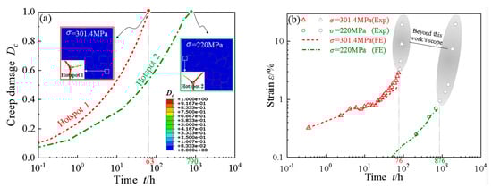 (a) Evolution curves of creep damage vs. time of hotspot 1 and 2 and the corresponding contour plots of creep damage; (b) Comparison of creep strain vs. time curves between experimental results [31] and simulations at stress of 301.4 MPa and 220 MPa at 600 °C.
