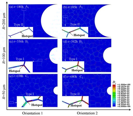 Contour plots of creep damage Dc: (a) Model A1 (R = 200 μm, Orientation 1); (b) Model A2 (R = 200 μm, Orientation 2); (c) Model B1(R = 100 μm, Orientation 1); (d) Model B2 (R = 100 μm, Orientation 2); (e) Model C1 (R = 50 μm, Orientation 1); (f) Model C2 (R = 50 μm, Orientation 2).