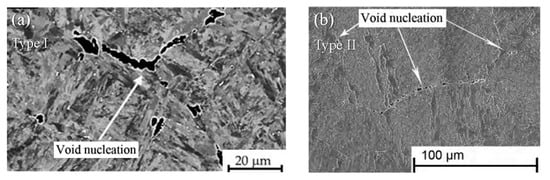 Nucleation and coalescence of cavities under creep conditions at (a) the triple junction (Type I, e.g., 9Cr1Mo-NbV [50]), and (b) the grain boundaries perpendicular (or almost perpendicular) to the loading direction (Type II, e.g., 25Cr2NiMo1V [51]).