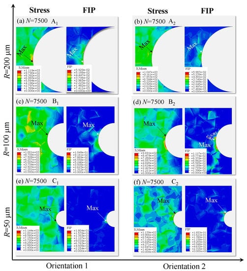 Distributions of von Mises stress and acumulative equivalent plastic strain FIPp (a) Model A1 (R = 200 μm, Orientation 1); (b) Model A2 (R = 200 μm, Orientation 2); (c) Model B1(R = 100 μm, Orientation 1); (d) Model B2 (R = 100 μm, Orientation 2); (e) Model C1(R = 50 μm, Orientation 1); (f) Model C2 (R = 50 μm, Orientation 2).
