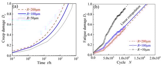 Evolution curves of (a) creep damage vs. time, and (b) fatigue damage vs. cycle of the hotspots in the specimens with different notch root radii.