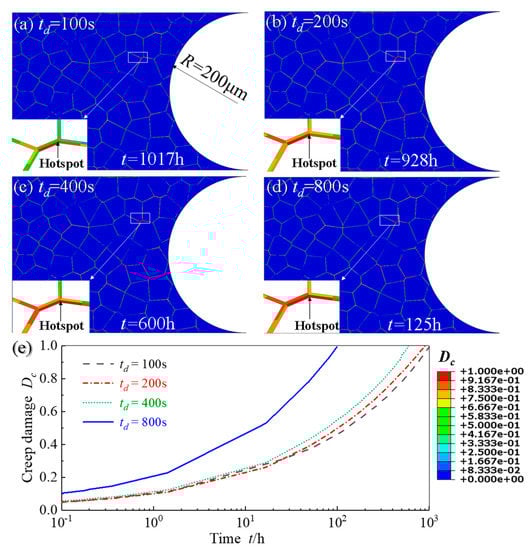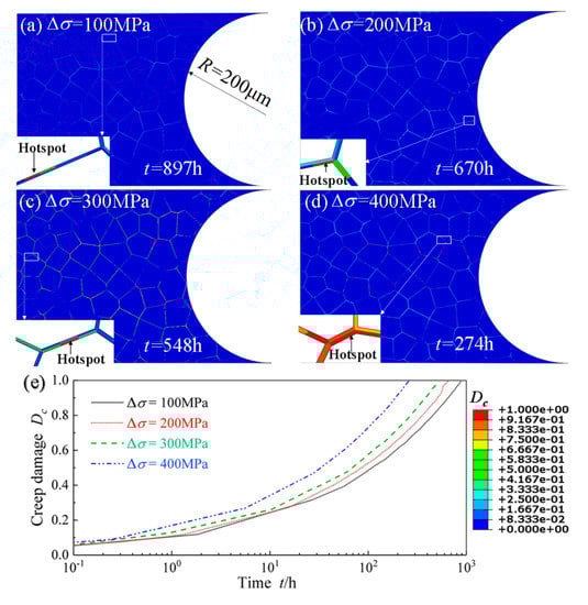 Figure 8a–d show the contour plots of creep damage under different stress ranges, exhibiting that the coalescence of cavities mostly occurs at the triple grain boundary junctions and the grain boundaries approximately perpendicular to the loading direction. The evolution curves of creep damage of hotspots with time under different stress ranges are shown in Figure 8e, from which it can be obtained that the time of creep crack initiation is reduced as the stress range increases.
