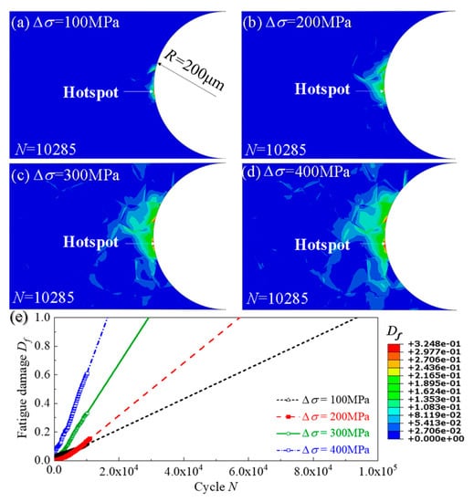 Figure 9a–d show the distributions of fatigue damage in the sub-models undergoing 10,285-cycle load at different stress ranges. Similarly, Figure 9e presents the evolution curves of fatigue damage of the selected hotspots. It can be seen that, despite the different stress ranges, the hotspots with the highest value of fatigue damage (i.e., the location of fatigue crack initiation) are always located at the grain boundary on the notch surface. However, as the stress range increases, the value of fatigue damage increases in the same load cycle, meaning that the increase of the stress range shortens the fatigue crack initiation life.