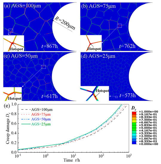 Figure 10a–d show the contour plots of creep damage Dc in the sub-models with four different AGSs, exhibiting that the coalescence of cavities mostly occurs at the triple grain boundary junction and the grain boundaries perpendicular to the loading direction. The evolution curves of creep damage of hotspots of the specimens with four different AGSs are shown in Figure 10e, from which it can be obtained that the time of creep crack initiation is shortened as the AGS decreases from 100 μm to 25 μm. This is due to the fact that as the grain size decreases, the proportion of grain boundaries increases significantly for the same sub-model. Since creep damage is mainly caused by the growth of cavities on grain boundaries, an increase in the fraction of grain boundaries will lead to a greater creep damage rate, which is also demonstrated in the studies [56,57].