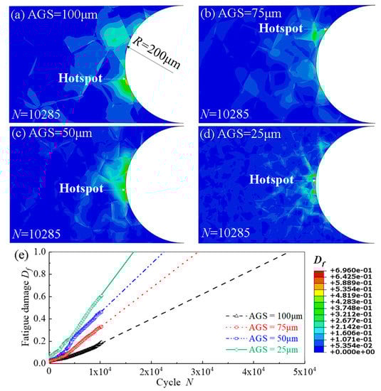 Figure 11a–d show the contour plots of fatigue damage Df in the sub-models with four different AGSs when N = 10,285, exhibiting that fatigue crack initiation locates at the grain boundary on the notch surface. The evolution curves of creep damage of hotspots of the specimens with four different AGSs are shown in Figure 10e, from which it can be obtained that fatigue damage decreases, indicating that the life of fatigue crack initiation is extended as the AGS decreases from 100 μm to 25 μm. Consistent with the phenomenon, the increase of the AGS prolongs the time of fatigue crack initiation, observed in the experiments of Qin et al. [58].