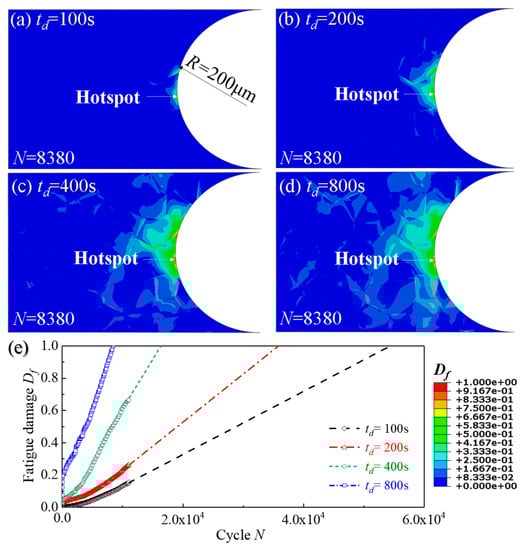 Distribution of fatigue damage of notch specimens for four different holding time: (a) td = 100 s; (b) td = 200 s; (c) td = 400 s; (d) td = 800 s and (e) the evolution curves of fatigue damage Df of hotspots from (a–d).