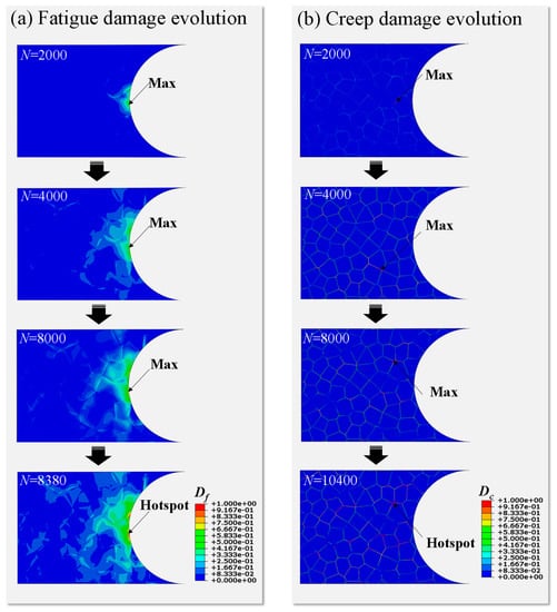 To illustrate the evolutions of fatigue damage and creep damage at grain boundaries in the sub-model, the holding time of 800 s is used as an example, as respectively shown in Figure 14a,b. It can be seen from Figure 14a that the accumulated equivalent plastic strain and fatigue damage are concentrated at the same location of notched surface during the whole fatigue lifetime. When N = 8380, the maximum of fatigue damage reaches a critical value, indicating that fatigue crack initiation occurs on the notched surface. It can be seen from Figure 14b that the locations of maximum creep damage always transfer before N = 8000. In addition, creep damage in the sub-model around the notch begins to appear at a limited number of grain boundaries when it undergoes 2000 cycles of loading. As the number of cycles increases, the overall damage accumulates at the grain boundaries to greater extent. In particular, the accumulations of damage at the triple grain boundary junctions and at grain boundaries approximately perpendicular to the loading direction are more significant. With the number of cycles increasing to 10,400, maximum creep damage at hotspot accumulates to 1 and the creep crack initiates.
