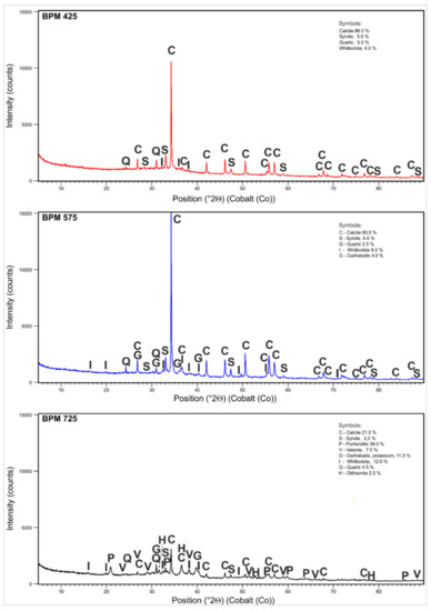 Due to the fact that biochars produced from poultry manure demonstrated significant contents of mineral substances, the investigated poultry-manure-derived biochars were also subjected to the phase analysis with XRD method. The obtained results are presented in Figure 1 and Table 5. In the BPM425 and BPM575 biochars, calcite is the predominating mineral phase whereas, in the BPM725 biochar, the content of calcite is 4-fold lower. This is due to the thermal decomposition of CaCO3 and the presence of a new carbonate phase which is vaterite. The presence of numerous mineral phases containing Ca is confirmed by the chemical composition of the investigated biochars (Table 3). The presence of mineral phases bound with phosphorous is observed in all biochars in the form of phosphates. The highest content of phosphates in the form of whitlockite is detected in the BPM725 biochar which was confirmed by the content of phosphorous in this biochar (Table 3). The presence of whitlockite as a mineral phase in biochars produced from animal-derived biomass was also confirmed by Cao and Harris [35]. Potassium was bound in the form of sylvite in all biochars. However, in BPM575 and BPM725 biochars, potassium is also present as a mineral phase, i.e., gwihabaite.