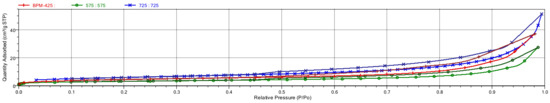The obtained physicochemical properties of biochars are presented in Table 4. All types of biochars demonstrated alkaline reactions (pH > 10) which increased with the increase in the pyrolysis temperature. The obtained pH values can indicate a significant potential of these biochars toward the sorption of positively charged ions of heavy metals [26]. The content of ash in biochar was high and increased with the pyrolysis temperature reaching values in the range of 52.07–78.38%. High contents of ash are usually detected in biochars derived from excreta, e.g., sewage sludge and poultry manure [32,36], and thus can affect the specific surface area of biochars. According to Novak et al. [32], inorganic constituents of ash can block the pores and thus reduce the specific surface area. However, the mineral fraction of biochars can play an important role in the process of sorption of heavy metal ions. This is even more important than the biochar structure [26]. The BET surface area of the investigated biochars reached the maximum value (19 m2·g−1) for the BPM725 biochar which is high in comparison to the results obtained by other researchers. For example, in the work Zhao et al. [37], the specific surface area of biochar produced at 550 °C was 7.09 m2·g−1. The adsorption–desorption isotherms for the investigated biochars are presented in Figure 2.