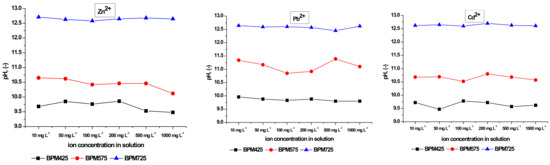 Adsorption (A) was calculated for each metal and the initial metal concentration in the solution (the biochar dose of 100 g·L−1) based on Formula (2). The analysis of the obtained results (Table 7) showed that the sorption capacity of Zn, Cd and Pb for the BPM425 was in the range of 0.0985–9.9935 mg·g−1, 0.0999–9.9793 mg·g−1 and 0.0995–9.9866 mg·g−1, respectively. Similar values were observed for the BPM575 and BPM725 biochars in the entire range of investigated concentrations of ions in the solutions. With the increase in the concentrations of the selected metal in the solution, the sorption capacity increased for all investigated biochars. This shows that these biochars still demonstrate unutilized capability for the sorption of metals. No relationship between sorption capacity for a selected metal ion and the type of biochar was observed. However, it has to be pointed out that the sorption capacity for Cd demonstrated a significantly higher value for this ion in comparison to Zn and Pb in the assumed experimental conditions. Park et al. [39] observed the opposite relationship in their study on biochar produced at 550 °C from poultry manure. The researchers explained this by the lower value of the electronegativity constant for Cd (0.69) in relation to Pb (2.33).