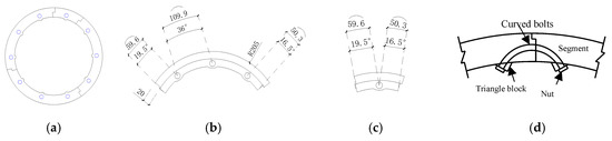 The LCSS design was divided into structural and connection designs. The structural design determined the preassembly form and segment dimensions. The LCSS was divided into two parts, namely the standard segments and adjusting segment; the sleeve ring consisted of three standard segments and one adjusting segment, as well as a setting rabbet between the segments. The dimensions of the segment were determined based on the self-stress, load, thickness of the concrete cover, diameter of the PVC pipe, and the construction technique. The structure of the LCSS is presented in Figure 1, and the segment dimensions of the specimens are designed as follows: inner diameter of 165 mm, outer diameter of 205 mm, thickness of 40 mm, height of 170 mm. The connection for the LCSS was designed in the same way as the connection for the shield lining segments. Specifically, for circumferential connection of the segments, the holes for fixing bolts were reserved through the pre-embedded PVC pipes and then the curved bolts and triangular pad were utilized to connect the segments. Regarding the longitudinal connection of the segment, the hole was also reserved first, then the long bolts and nuts were used to connect the segments. In this test, the diameter of the PVC pipe was 16 mm and the diameters of the circumferential and longitudinal bolts were 6 mm and 8 mm, respectively. Three circumferential connections were arranged along the longitudinal equal spacing of each segment ring, and 10 longitudinal connections were arranged at equal intervals along the circumference; the connections of the segments are shown in Figure 1. The prefabricated mold of the LCSS was designed and is shown in Figure 2. The size of the segments and location of the PVC pipe complied with the requirements found in [14].