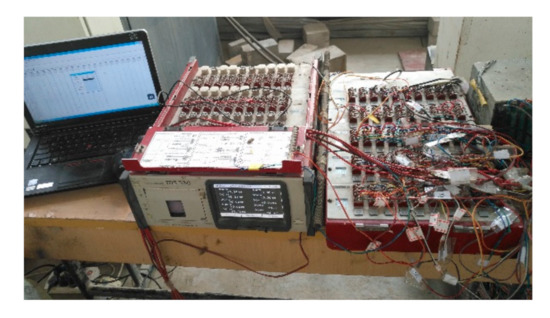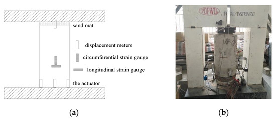 The positions of displacement meters and strain gauges are given in Figure 3. A YHD-50 displacement meter was fixed at the top of the specimen to record the deformation of the sand mat, which was used to eliminate the impact of the uneven loading plate. Four YHD-50 displacement meters were fixed on the actuator of the loading device at equal angle intervals to record the longitudinal displacement of the specimen. At the half height of the specimen, four 100 mm concrete strain gauges were fixed on the outer surface of the sleeve along the circumferential and longitudinal directions to record the circumferential and longitudinal strains of the sleeve, respectively. At the same time, at the half height of the self-stressed reinforced specimens, four 80 mm concrete strain gauges were fixed on the inner surface of the sleeve along the circumferential and longitudinal directions to record the circumferential and longitudinal strains of the filled concrete, respectively. Both the displacement and strain time histories were recorded using a TDS-530 static data collector with an acquisition frequency of 0.5 Hz, as shown in Figure 4.