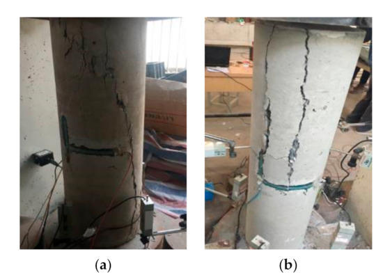 Figure 7. Failure of the unreinforced specimens. (a) P1 axial compression failure; (b) P2 axial compression failure. - (2)