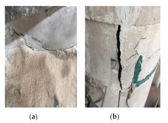 - Ordinary strengthened specimen: Figure 8 shows the failure of specimen S1-A. Under the load of 1760 kN, the first concrete crack appeared at the interface between the filled concrete and the column. Then, with the increase in the load, the concrete crack gradually developed towards the segment sleeve and crisp sound could be heard, which was judged to be the fracture of the welded steel wire mesh. When the load was close to 2147 kN, several segments fractured and the bearing capacity of S1-A reached its peak, then the bearing capacity dropped until the failure of S1-A. The cracks were concentrated in the concrete cover of the longitudinal bolt, as well as the joint of the LCSS and the interface between the filled concrete and the column. It should be noted that all bolts remained unbroken.