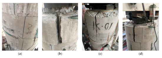 - Self-stressed strengthened specimens: The failure process and modes of the three strengthened specimens were similar, as shown in Figure 9. When the load was close to 2000 kN, the first crack appeared in specimen S1-S, then the crack developed with the increases in load, making a cracking sound in the process. When the load reached 2600 kN, several segments broke and the bearing capacity of specimen S1-S reached the peak and stabilized for a period of time. Then, the bearing capacity dropped and the cracks appeared at the interface between the filled concrete and the column when the bearing capacity dropped to 2250 kN. Finally, as the load decreased continuously, multiple cracks penetrated and the specimen failed. When specimen S1-SS was loaded to 1730 kN, cracks of concrete appeared in the segment concrete. When the load was close to 1850 kN, interface cracks appeared and developed toward the segments. When the load was close to 2150 kN, the segments at the top of the specimen almost failed and the bearing capacity reached the peak, then bearing capacity continued to decrease with long penetrating cracks appearing in many places until the specimen failed. When specimen S2-S was loaded to 1500 kN, concrete cracks appeared in the segment. When it was loaded to 1920 kN, fractures occurred in the segment due to the penetration of the cracks and the bearing capacity reaching the peak. Then, the bearing capacity decreased with the appearance of long penetrating cracks and the specimen finally failed. In this group, the cracks were concentrated on the concrete cover of the longitudinal bolt and the segment joints and none of the bolts were broken. Through testing and calculation, the self-stress values of the reinforced specimens could be obtained, as shown in Table 6.